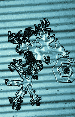 De même, si au cours de sa chute, le cristal rencontre une température positive, il peut commencer à fondre et donc à perdre sa forme originelle. La neige qui arrive au sol est donc humide et ne ressemble plus au cristal de départ.